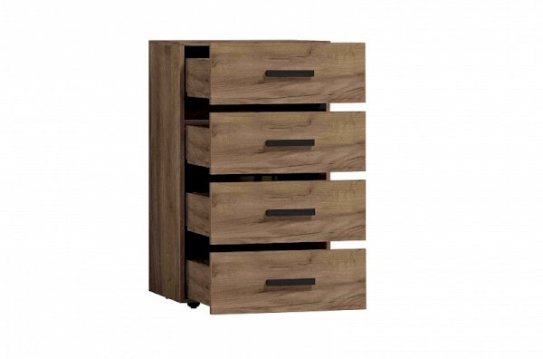 Для спальни отлично подойдет высокий комод Nature 45. Гладкие фасады ящиков в теплом декоре с контрастными черными боковыми планками снизу делают его по-настоящему особенным. Четыре выдвижных ящика способны вместить все необходимое, а компактная конструкция сэкономит место в комнате. Ящики легко открываются благодаря направляющим полного выдвижения. Они быстро и легко устанавливаются при сборке комода. Регулируемые опоры компенсируют незначительные неровности пола.
