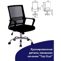 Кресло оснащено механизмом качания «топ-ган» с регулировкой под вес пользователя и возможностью фиксации спинки в рабочем положении.