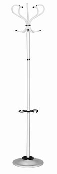 Фото напольной вешалки из оцинкованной стали с полимерным покрытием цвета под алюминий. Вешалка снабжена подставкой и держателем для зонтов. Данная модель вешалки идеально вписывается в интерьер современного кабинета.