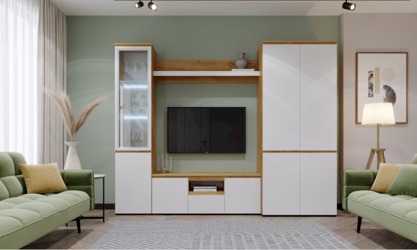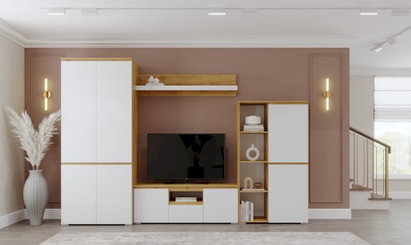 Крепится к стене через навесные элементы. Может использоваться индивидуально, а также может быть дополнительным элементом к тумбе ТВ.