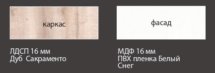 - Коллекция представлена в следующем цветовом решении: Корпус ЛДСП 16 мм  в декоре «Дуб Сакраменто» и фасад МДФ 16 мм в декоре  «Белый снег глянец»