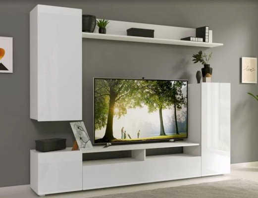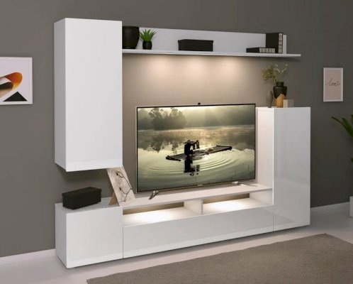 Стенка Лия выполнена в современном европейском стиле. Её дизайн совмещает в себе современные тренды: белый глянец, скругленные фасады МДФ, отсутствие лицевой фурнитуры. Белый цвет отлично сочетается со всей цветовой палитрой, что позволяет создавать яркий интерьер и компоновать с другой мебелью. Стенка включает в себя нишу под ТВ с открытыми и закрытыми полками для размещения приставок, медиа устройств, книг и элементов декора. Дополнительно гостиная комплектуется точечной подсветкой.