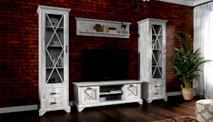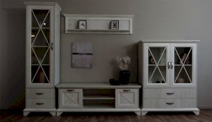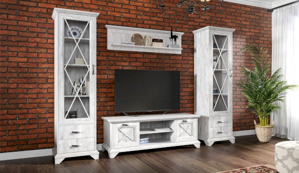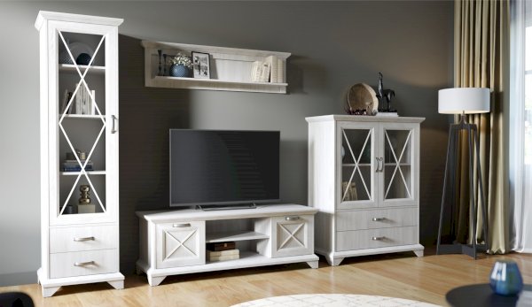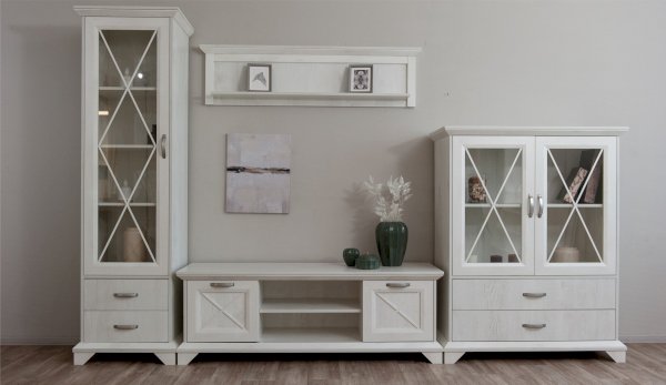 Пенал-витрина добавит уюта в интерьер гостиной в стилях неоклассика или прованс. Белые рамочные фасады с фактурой и рисунком натурального дерева, декоративные крестообразные накладки, фигурные ножки и карниз все это придает комнате элегантный и светлый вид. За прозрачным фасадом можно расположить предметы декора, красивый сервиз или книги. Выдвижные ящики на телескопических направляющих предназначены для хранения различных вещей. Мебель выполнена из экологичных материалов.