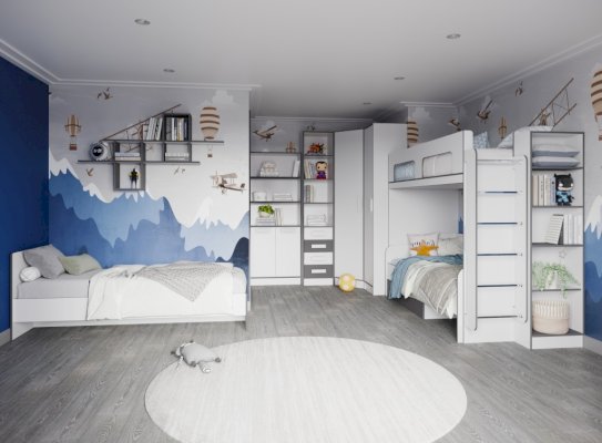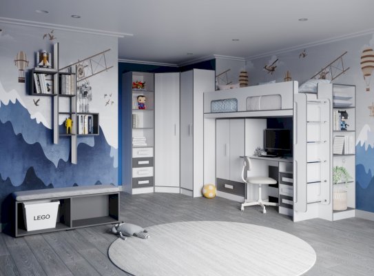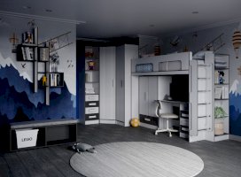 Кровать чердак спроектирована под одно спальное место и может дополняться вторым спальным местом (кровать с ящиками) или рабочим местом (шкаф малый, письменный стол).