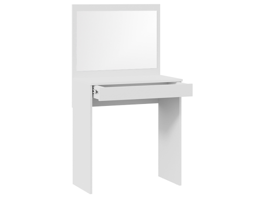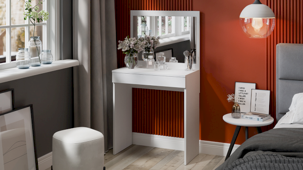 Несмотря на свои компактные размеры, туалетный стол имеет функциональный ящик с шариковыми направляющими для хранения парфюмерии, украшений и многого другого, достаточно вместительную столешницу, где можно разместить все необходимые аксессуары и полноценное зеркало. В этом туалетном столике нет ничего лишнего, только самое необходимое для уголка женской красоты.