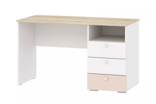 Данная модель дополнена небольшим модулем из трех выдвижных ящиков и открытой ниши. Вместительная полка под рабочей поверхностью прекрасно подходит для книг и тетрадей. Ящика с удобными ручками легко выдвигаются, предоставляя полный доступ к содержимому и позволяя быстро найти необходимый предмет. Скругленные ручки-кнопки  не имеют острых граней.