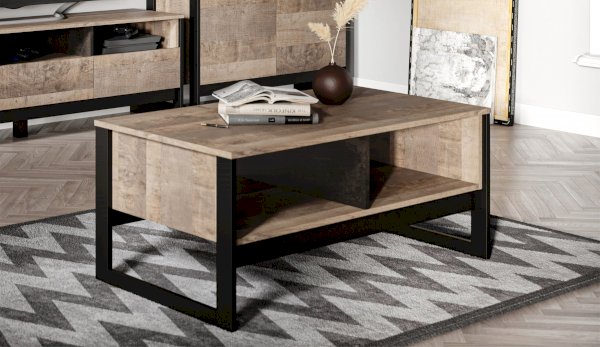 Стильный журнальный стол с полкой незаменимый предмет мебели для гостиной. Особенность дизайна – это сочетание реалистичных по цвету и тактильности трендовых декоров, которые соответствуют последним городским тенденциям. «Дуб Гранж» привлекает имитацией вручную обработанного дерева и выразительной зернистой текстурой, характерной формой досок. Стильный серый цвет «Железного камня» с металлическими разводами и новая текстура состаренной штукатурки в сочетании с гладкостью металла вносят индустриальный колорит. Оригинальные ножки-опоры из МДФ контрастного цвета придают изюминку интерьеру.